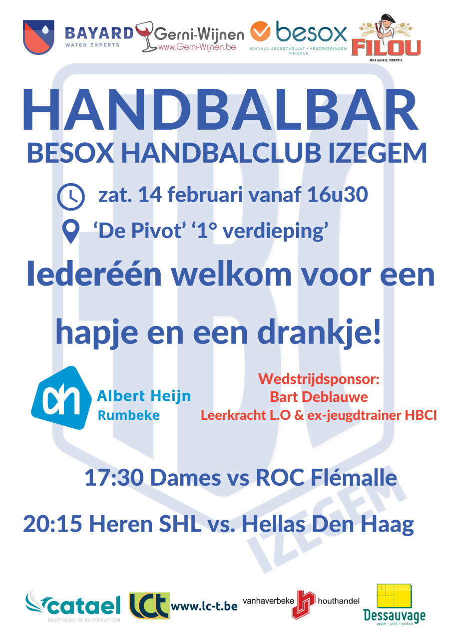 Op zaterdag 14 februari toveren we de Pivot terug om in onze HandbalBARRR. Iederéén welkom vanaf 16u30 voor een hapje en een drankje voor/tijdens en na de wedstrijden: